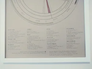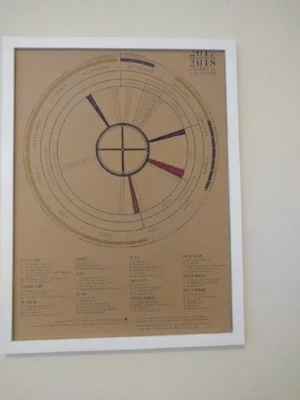 The calendar follows the Ordinary Form of the Catholic Liturgy and cover the full liturgical year. Seasonal liturgical colors are explained around the outer rim of the calendar. Holy days of obligation are found in the center, and feast days line the bottom of the poster.